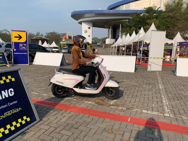 Salah seorang pengunjung di GIIAS Semarang 2023 sedang test ride motor listrik. (foto: istimewa)