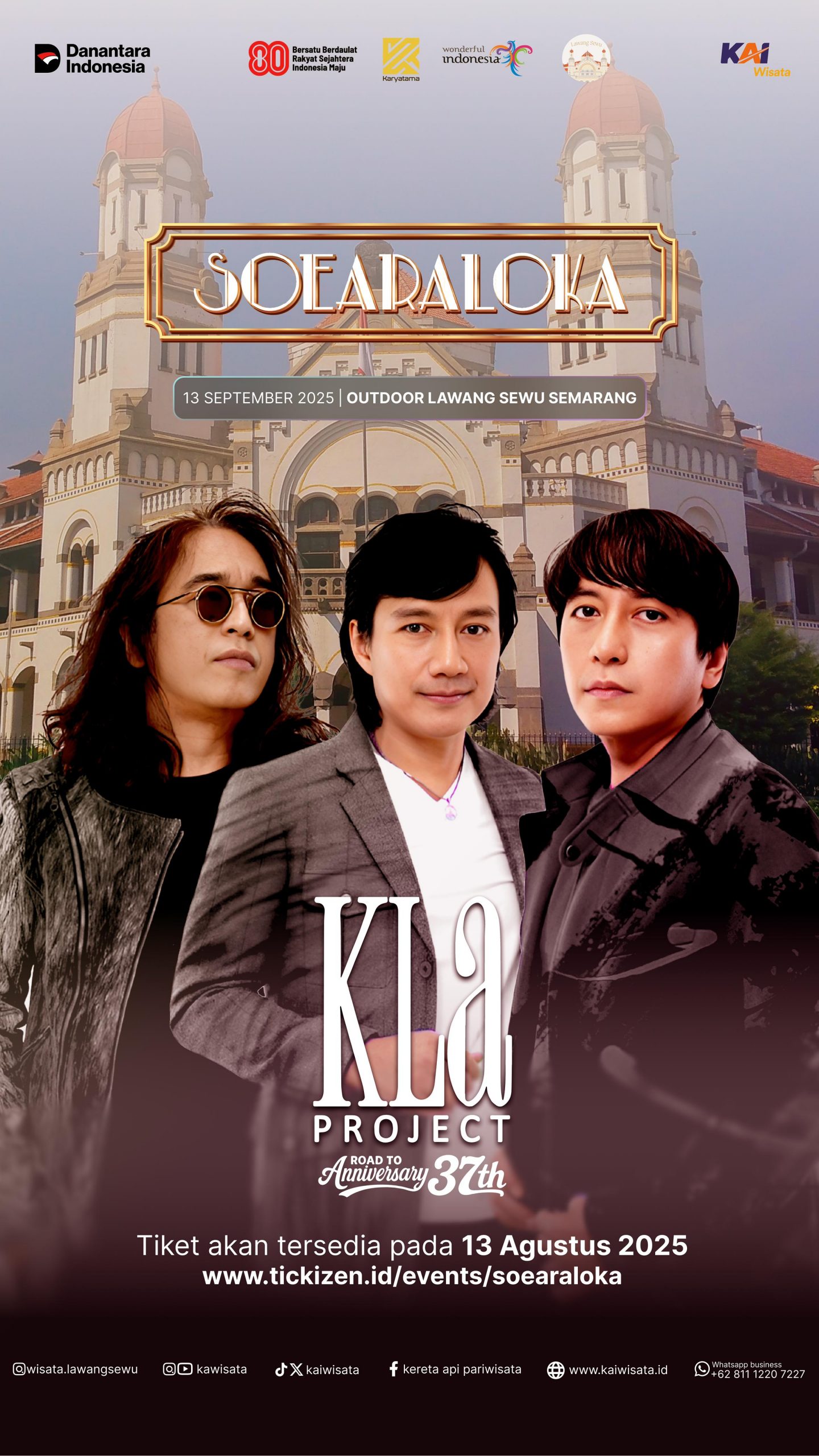 Semarangsekarang.com (Semarang),- PT Kereta Api Pariwisata (KAI Wisata), akan  mempersembahkan konser istimewa Soeara Loka – Road to Anniversary KLa Project 37th di Lawang Sewu, pada 13 September 2025. Konser ini menjadi bagian dari perjalanan menuju perayaan 37 tahun KLa Project, salah satu band legendaris Indonesia yang telah menemani lintas generasi dengan karya-karyanya.