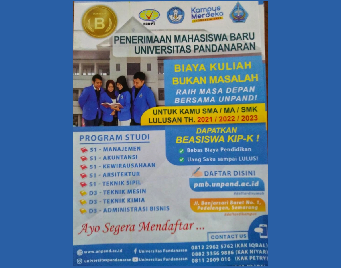 Semarangsekarang.com – Universitas Pandanaran (Unpand) Semarang membuka kesempatan bagi lulusan SMA sederajat tahun 2021/2022/2023 untuk menempuh pendidikan jenjang S-1 dan D-3 di perguruan tinggi yang dikelola Yayasan Abdi Masyarakat itu.