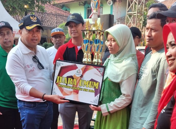 Plt Bupati Jepara, Edy Supriyanta (kiri) menyerahkan penghargaan dan Piala Bergilir kepada perwakilan siswa Sekolah Dasar Unggulan Terpadu (SDUT) Bumi Kartini Jepara, juara umum dalam Lomba Harlah SMPN 1 Pecangaan ke-60 (foto : ist)