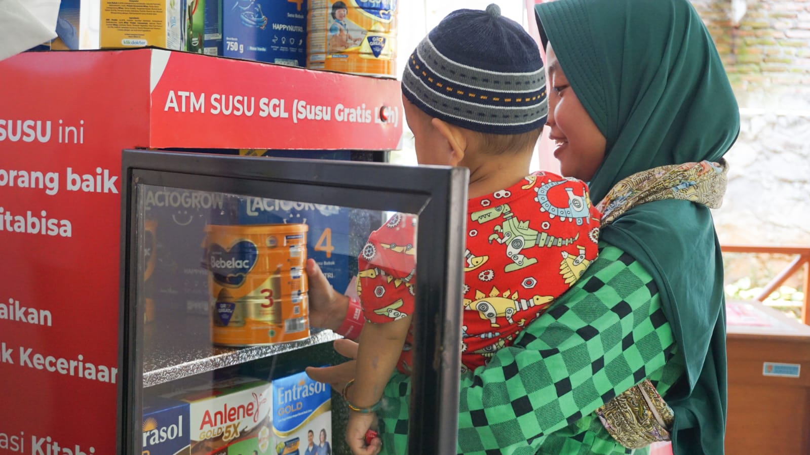 Seorang ibu sedang mengambil susu di ATM Susu. Salah satu program LAZiS Jateng, menyediakan ATM Susu Gratis Loh di Puskesmas Sekaran. (foto: lazis jateng)